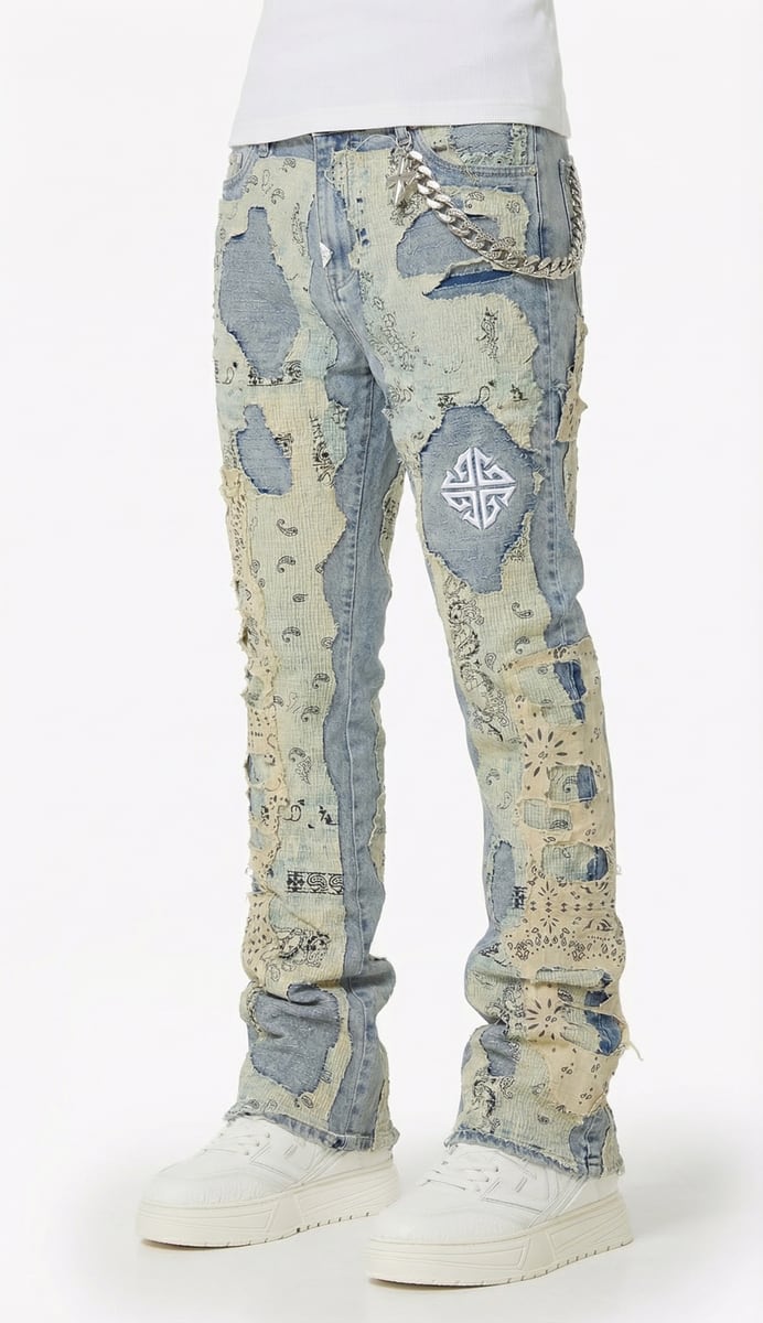 ヘビーなディストレス加工は、ほつれた開口部を通して下層のデニムを露出させ、補強されたステッチが構造と耐久性を高めます。パッチワーク全体に施された繊細なグラフィックプリントがジーンズに古びたアーカイブ風の外観を与え、シグネチャー刺繍エンブレムで仕上げられ、独自のGUAPIアイデンティティを表現しています。