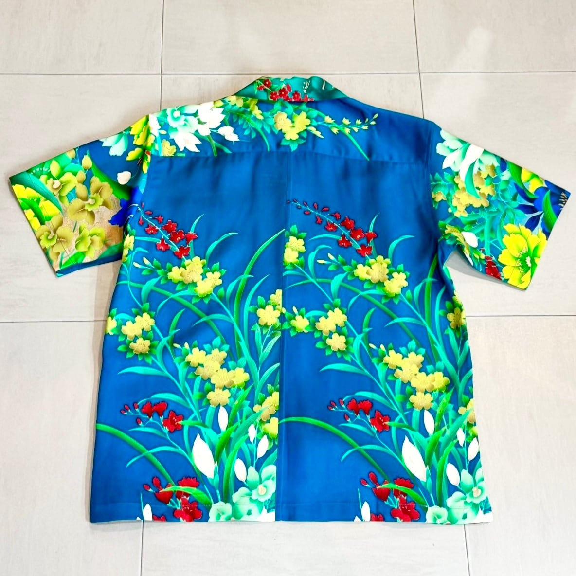 ヴィンテージの着物をほどき、ナチュラルな風合いのココナッツボタンを合わせたアロハシャツです。伝統的な和柄が際立つ、世界にひとつだけの特別な一枚。